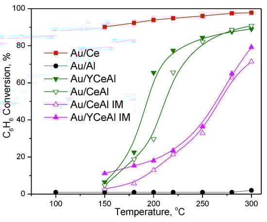 The degree of benzene conversion over Au/CeAl was below 10% at 150 °C. However, it sharply increased after rising the reaction temperature and attained almost 80% at 220 °C. In contrast, the benzene conversion over gold catalyst, supported on prepared by impregnation CeO2/Al2O3, i.e., Au/CeAlIM, showed gradual enhancement with increase of reaction temperature. Finally, this catalyst demonstrated benzene conversion below 80% at 300 °C. Additionally, results presented in Figure 1 indicated beneficial role of Y-doping of CeO2/Al2O3 on activity of gold catalysts. This effect is well visible over gold catalyst on prepared by MM support. It exhibited 63% conversion at 200 °C, while 28% conversion was measured in case of gold catalyst on undoped support.
