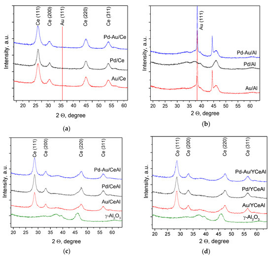 The PXRD patterns are grouped in Figure 4a–d depending on the type of support. As displayed in Figure 4a, four diffraction peaks at 2θ = 28.5°, 33.1°, 47.5° and 56.4° indicated the presence of CeO2 in the cubic crystal structure of fluorite-type. There were no reflections related to gold or palladium, because of their small amounts and high dispersion. The calculation of the average gold particles size on the basis of High resolution transmission electron microscopy (HRTEM) and high angle annular dark field (HAADF) measurements indicated that despite the support preparation method, the size was very similar (2–3 nm) [29,30]. In contrast, very strong diffraction peaks at 2θ = 38.2° and 44,4° due to the formation of quite big gold particles were observed in the patterns of Au/Al and Pd-Au/Al (Figure 4b). The calculated average size was 32 and 40 nm, respectively. The larger size of gold in the bimetallic sample probably was caused by additional thermal treatment at 400 °C after deposition of Pd.