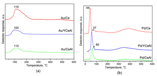 The reducibility of the catalysts, estimated by TPR, reflects the catalyst oxygen mobility, which is crucial for the Mars–van Krevelen mechanism. The obtained results for monometallic Au and Pd catalysts are compared in Figure 5. TPR profiles of Pd-Au catalysts (not shown) cannot be informative for the role of bimetallic composition because in the presence of hydrogen small paladium and gold particles form non-active inter-metallic species having no effect on the low temperature ceria reducibility. Such behavior was already observed in our previous investigations [22,23] and the decreased surface ceria reducibility was explained by formation of AuxPdy alloy particles [22].