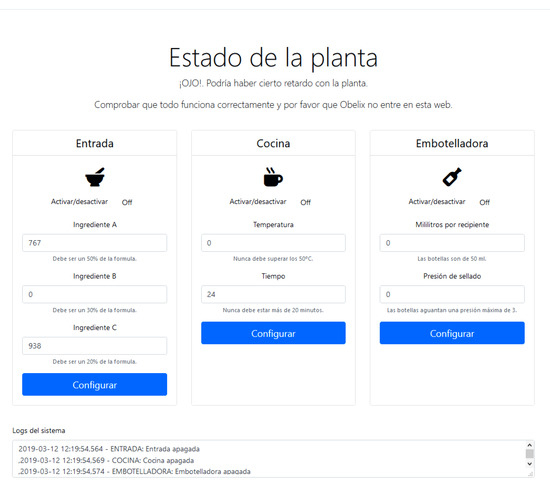 Each of these elements has a controller. A monitoring system has been created on each controller, whose interface consists of a series of RESTful services for allowing the information exchange. These services are developed for checking the controller status, switching it on/off, and establishing ingredient values (in Entry), temperature and time (in Kitchen), and quantity and closing pressure (in Bottling).