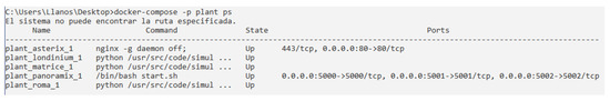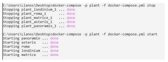 As an example, Figure 6 shows the corresponding commands to start and stop the network of containers belong to the plant. These are the ones viewed in Figure 4. It is necessary to use the specific command to compose a set of specific containers with a set of parameters, such as name, configuration file, among others.