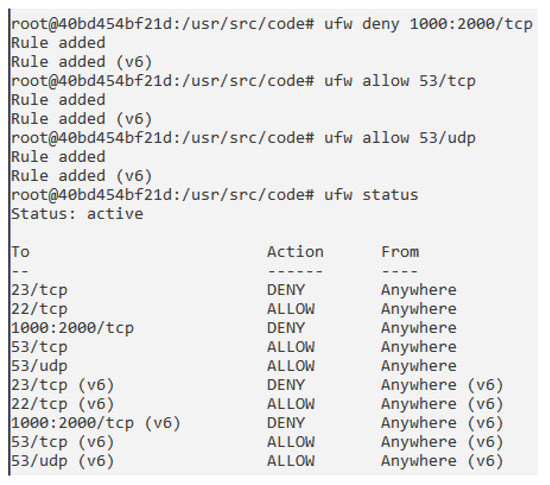 - Providing the internal network with the most suitable policy access, using Uncomplicated Firewall (UFW) [43] rules. These actions will lead to a better control of the network access. In particular, Figure 7 shows an example of use, in which the student establishes a set of firewall rules, such as denying a set of TCP ports, allowing specific TCP and UDP ports, and checking the status of the firewall. All these actions are performed in the container which supports the firewall.