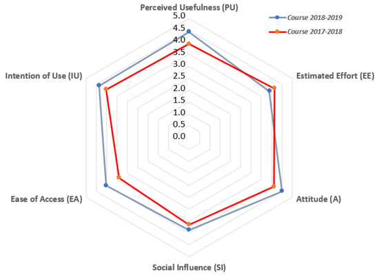 Therefore, we can conclude that neither the use of the virtual platform nor the elements more related to the distance methodology employed during the teaching/learning process affect the intention of using the proposed technologies (LoT@UNED and CVL) during academic years 2017–2018 and 2018–2019. The other option would be that those elements are affected by the technology employed, but always at the same level and hence no differences can be found between the two academic years analyzed. These results enforce the analysis performed about the students’ acceptance, in terms of perceived usefulness, estimated effort, attitude, social influence, or ease of access, since the studied populations are similar and comparable in both academic years (as indicated in Section 4.1. This represents an added value regarding the hypothesized and validated SEM models in this work.