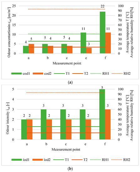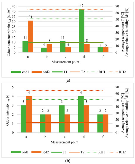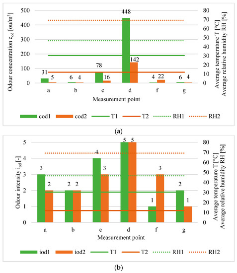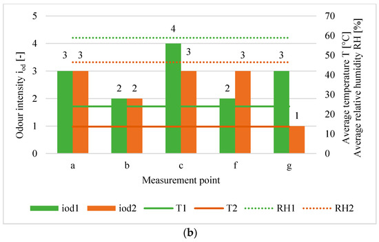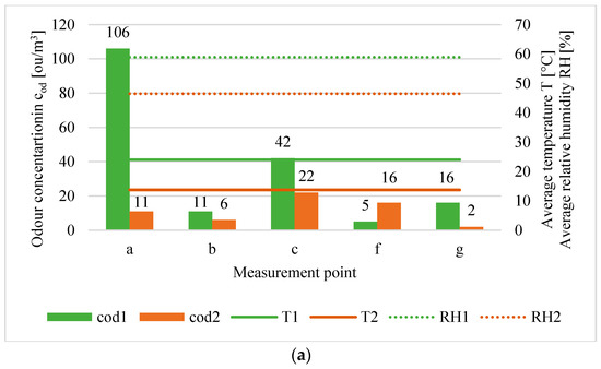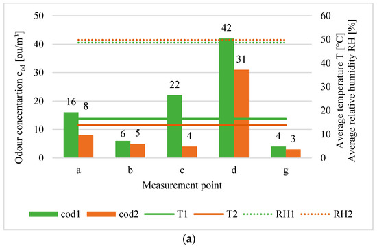 Figure 2, Figure 3, Figure 4, Figure 5, Figure 6 and Figure 7 show the results of odour concentration (cod) and intensity (iod) at individual odour sources (a–g) at the analysed biogas plants (for two measurement series: 1 and 2) in combination with the average temperature (T) and average relative humidity of air (RH). Air temperature and humidity values indicated in the figures are the arithmetic mean of the values measured at individual measuring points during one measurement series.