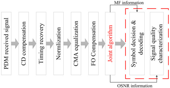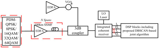The DSP configuration of the proposed joint algorithm is shown in Figure 1. After chromatic dispersion (CD) compensation, timing recovery, normalization, constant modulus algorithm (CMA)-based equalization, and frequency-offset (FO) compensation for compensating nearly all linear transmission impairments, signals are mainly affected by amplified spontaneous emission (ASE) noise [29,43,44]. The proposed DBSCAN-based joint algorithm can extract MF and OSNR information which are used in subsequent DSP blocks such as symbol decision, decoding and signal quality characterization.
