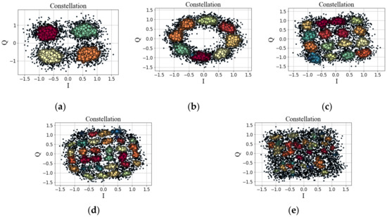 Clustering results for five MFs. (a) QPSK; (b) 8PSK; (c) 16QAM; (d) 32QAM; (e) 64QAM.
