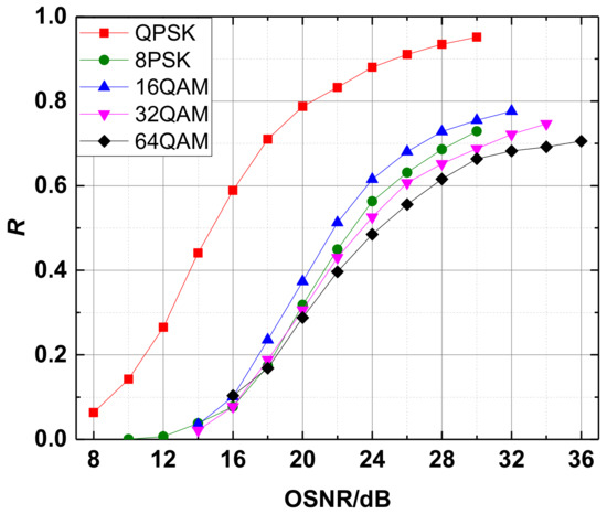 As OSNR increases, the effect of ASE noise on the signal decreases, leading to the constellation points better concentrated than lower OSNR conditions. According to the introduction of DBSCAN algorithm, the neighborhood parameters (ε and MinPts) set a density threshold on symbols. The core points are the symbols which are reaching the density threshold. If the symbols are getting better concentrated, the number of core points apparently increases leading the R value increases. So parameter R defined by Equation (1) is positively correlated to OSNR for five MFs and is showed in Figure 3.
