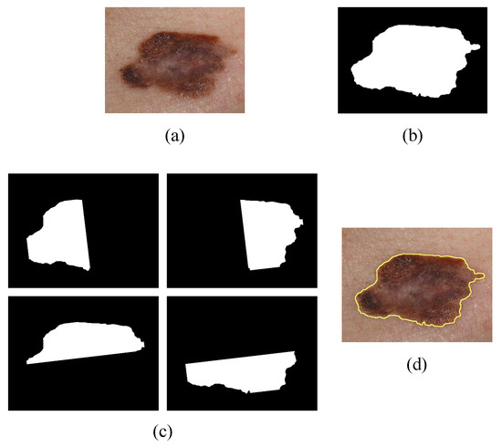 Example of the detection and classification of melanoma corresponding to Algorithm 1. (a) the input image ; (b) corresponds to the identification of possible cases of melanoma after noise and skin removal ; (c) shows the semiplanes formed for the evaluation of symmetry a; (d) the edge identified d.