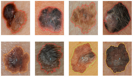 Algorithm 2 shows the corresponding pseudocode for image conditioning, skin removal, and identification of possible cases of melanoma. Figure 4 shows four examples of conditioning and identification of potential cases of melanoma.