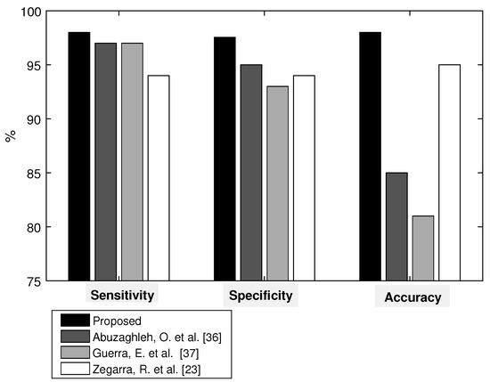 The validation was divided into two stages; the first was the cross-validation using Equations (4)–(7), and the second was statistical analysis. According to the results, the method has better efficiency than conventional methods since, after applying the equations, an efficiency of 97.78% for simple images and 98.22% for dermatological images was obtained. Table 4 shows the precision values obtained in the iterations for both simple and dermatological images. Figure 11 illustrates the comparison of the efficiency levels of the development method with studies that used the same type of images and datasets.