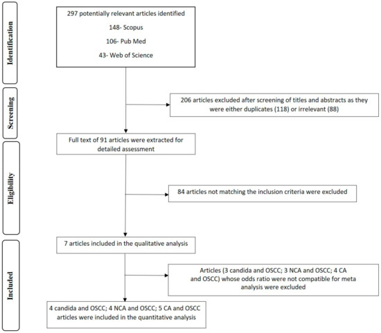 Keywords ‘Candida and oral squamous cell carcinoma’, identified 297 (PubMed-106, Scopus-148, Web of Science-43) articles.