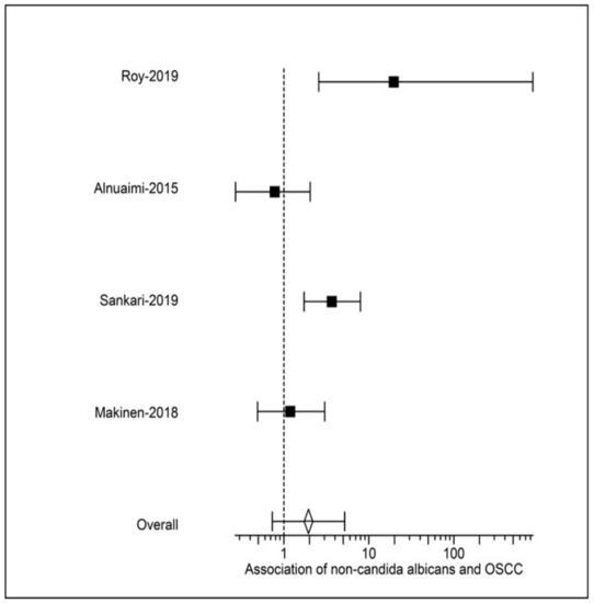 The odds ratio and 95% confidence interval for the Candida species specificity as estimated from each of the included studies is provided in Table 3. Based on the individual odds ratio, the overall ratio was estimated for CA and NCA prevalence in OSCC as 2.75 (95% confidence interval of 1.13–6.71) and 1.95 (95% confidence interval of 0.73–5.20) respectively as shown in Table 4. The overall ratio of each species of the NCA was not calculated as the number of studies providing compatible data was limited (only one or two studies). Similar to Candida prevalence, the estimated overall ratio for CA and NCA was used to generate the forest plots as shown in Figure 3 and Figure 4 respectively. The data revealed a significant association between CA and OSCC, while the association between NCA and OSCC was not significant.
