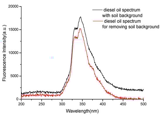 In the first set of experiments, the fluorescence spectra for a set of soil samples prepared as described in the previous section were detected. The typical fluorescence spectra of diesel oil before and after preprocessing by baseline correction are shown in Figure 2. One can observe from Figure 2 that the fluorescence peak of diesel oil is significantly influenced by the soil organic matter, polycyclic aromatic hydrocarbons, and so on. In order to eliminate the influence of fluorescence spectra by soil background, the data that follows in this paper are all the fluorescence spectra of diesel oil for removing soil background.