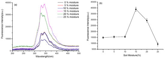 The fluorescence spectra of diesel oil in different soil moisture. (a) The fluorescence spectra; (b) the change regularity of the fluorescence peak intensity.