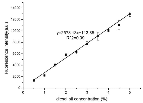 The calibration curve between the fluorescence peak intensities of diesel oil and the known concentrations of the diesel oil are shown in Figure 4. It notes that the square correlation coefficient value is 0.99, which verifies that the fluorescence peak intensity of diesel oil can be used to predict the concentration of diesel oil in soils.