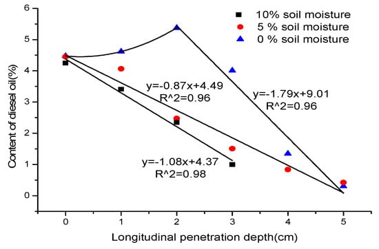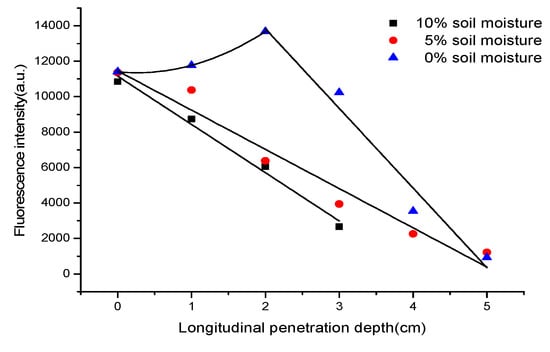 Figure 5 indicates that the diesel oil deposits in 0–6 cm below the surface of the soil. When the soil moisture is 0%, the fluorescence intensity of diesel oil increases with increasing soil depth, but after 2 cm depth later, the fluorescence intensity of diesel oil gradually decreases with depth. When the soil moisture is 5% or 10%, the fluorescence intensity of diesel oil gradually decreases with increasing soil depth. Then the fluorescence intensities were taken into the calibration curve, and the concentrations of diesel oil at different depths were calculated. As shown in Figure 6, when the soil moisture is 0%, the concentrations of diesel oil in soils versus the longitudinal penetration depths are conformed to quadratic law, but after 2 cm depth later, the concentration of diesel oil gradually decreases with depth. When the soil moisture is 5% or 10%, the concentration of diesel oil gradually decreases with the penetration depth increasing and a nearly linear relationship exists between the concentrations of diesel oil and the longitudinal penetration depths. The square correlation coefficients of the calibration curves are all above 0.95, which implies that the diesel oil accumulation in soils decreases linearly with the penetration depth increasing, and the longitudinal penetration depth decreases with the increasing of soil of humidity.