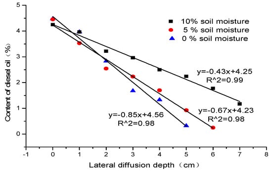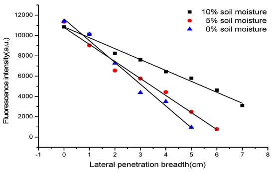 As shown in Figure 7, we can detect the fluorescence of diesel oil 5 cm away from the central point of the pollution source. Then the fluorescence intensities were taken into the calibration curve, and the concentrations of diesel oil at different breadths were calculated. Figure 8 indicates that there are good linear relationships between the concentrations of diesel oil and the lateral diffusion breadths away from the central point of the pollution source in different humidity soils. The square correlation coefficients of the calibration curves are all above 0.98, which implies that the amounts of the lateral diffusion of diesel oil in soils decreases linearly with the transverse diffusion distance increasing. As shown in Figure 8, we can observe that the lateral diffusion breadth increases with the increasing of soil humidity.