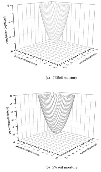 On the basis of diesel oil diffusion shown in Figure 6 and Figure 8, we can calculate that the longitudinal penetration depths of diesel oil in different soil samples with the moisture of 0%, 5%, 10% are 5.05 cm, 5.10 cm, 4.11 cm, which are shown in Table 1, and the lateral diffusion breadths of diesel oil are 5.36 cm, 6.44 cm, 10.11 cm, when 5.3 g diesel oil was quickly dropped on the surface of soil by a pipette.
