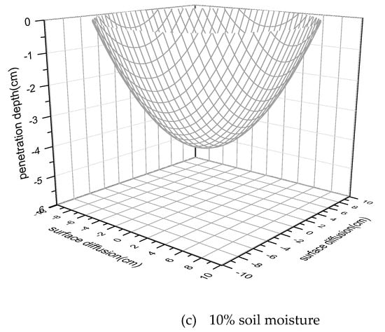 Then the three-dimensional diffusion models of diesel oil in different moisture soils are established and shown in Figure 10. For estimating the total amounts of diesel oil which were dropped in soils, the three-dimensional diffusion models and the calibration curve were used. Assuming that the diffusion laws in longitudinal direction are consistent, to validate the accuracies of the calibration curve and the three-dimensional diffusion models of diesel oil in soils, a way of calculating triple integral by the use of symmetry is utilized. The calculated weights of diesel oil in different soil samples with the humidity of 0%, 5%, 10% are 5.57 g, 5.81 g, and 5.72 g. These results gained through the three-dimensional diffusion models show that the relative standard deviations of the predictions for the total weights of diesel oil in soils are 5.09%, 9.62%, and 7.92%, therefore the accuracies of the calibration curve and the three-dimensional diffusion models are verified by the error analysis.