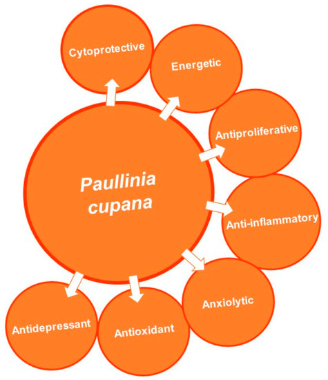 Paullinia cupana (guarana) is a Brazilian plant (subfamily Sapindoideae) known for its stimulant and medicinal properties [3,4]. Guarana has been associated with diverse pharmacological properties, such as antiproliferative [5], anti-inflammatory [6], antioxidant, and cardioprotective [4,7,8]. Moreover, it would have cytoprotective [4], energetic, thermogenic [9], antidepressant [10], and anxiolytic [11] qualities (Figure 1). This natural product is commonly consumed by dissolving the powder of its seeds in water or in association with other herbal drugs. Currently, guarana is exploited on a large scale by food supplements and the soft drinks industry for its effects on physical performance and body mass control [4].
