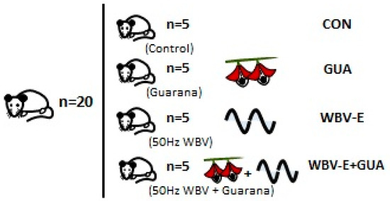 Wistar rats (n = 5 per group) were divided randomly into the following groups (i) control (CON), (ii) treated with guarana (GUA), (iii) submitted to 50 Hz of WBV (WBV-E), and (iv) treated with guarana and submitted to 50 Hz of WBV (GUA + WBV-E), as shown in Figure 2. Daily, for 6 weeks (40 days) the CON group received [35] 1.0 mL of deionized water and the GUA group received 1.0 mL of aqueous extract of guarana at 250 mg/mL by gavage. Furthermore, the WBV-E group received 1.0 mL of deionized water and the GUA+WBV-E group received 1.0 mL of aqueous extract at 250 mg/mL and, then, were exposed to MV.