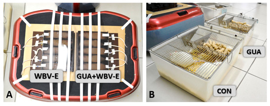 Rats from the groups WBV-E and GUA + WBV-E (Panel A) are placed on the base of the vibrating platform (VP) turned on. At the same time, the groups CON and GUA (Panel B) are put close (about 20 cm) to the VP.
