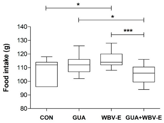 The study of the effect of guarana extract and/or WBV on the food intake and body mass for 6-weeks of intervention, revealed that the animals treated with guarana and WBV (the GUA + WBV-E group) had a significant decrease (p < 0.05) in food intake as compared with the CON group. However, the animals treated with guarana (the GUA group) had no statistical decrease in food intake as compared with the CON group but had a feed consumption higher than that of the GUA + WBV-E group. The animals treated with only WBV-E (the WBV-E group) had a statistical increase in food intake as compared with the CON group (Figure 4). The ε2 (not shown in the figure) was 0.1216, indicating a small relationship.