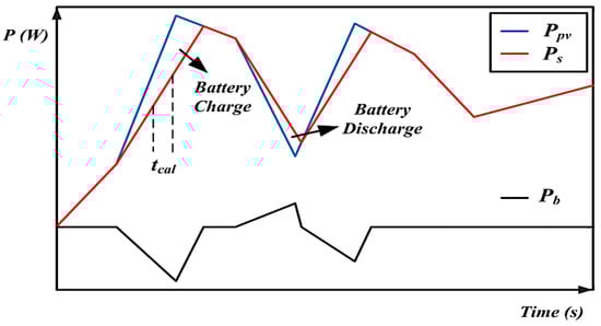 The ramp-limit controller smoothens the PV output variations [25] and the output PV power is limited by a constant limiter value (Plimit). The rate of rise or fall should not be more than the maximum allowable ramp-limit, called the ramp-limit of RES. The maximum allowable ramp-limit or calculated time-step (tcal) is 10%/min. The charge/discharge characteristics of a battery using ramp-limit control are shown in Figure 4. The battery-1 power (Pb1) is the difference between PV power (Ppv) and smoothed power (Ps). Then, the charge/discharge of the battery is regulated by the difference measured with the existing value of PV output. If the battery power is negative, it will charge. Conversely, if the battery power is positive, it discharges.