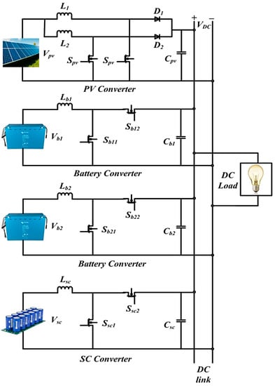 The proposed µG structure is shown in Figure 6. The structure consists of a PV source, two batteries, and a SC associated with an IBC and bidirectional converters to the DC link, and also a DC load linked at the DC link terminals. These converters are operated in current-controlled mode. A voltage controller is used to sustain the reference voltage across the load at the DC link. The generation of reference currents for battery and SC converters is described below.