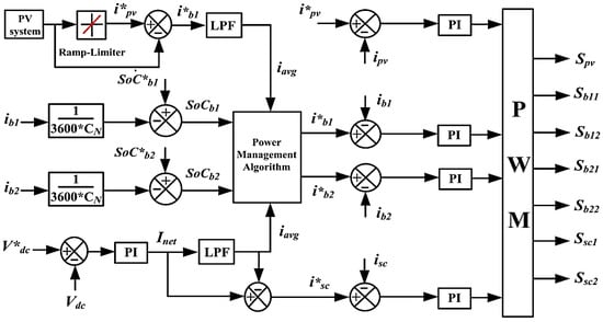 The proposed system control configuration is shown in Figure 9. The voltage controller output is reflected by the variations in DC link voltage. Thus, the storage converters can supply the net current (inet) to obtain the power balance at the DC link.