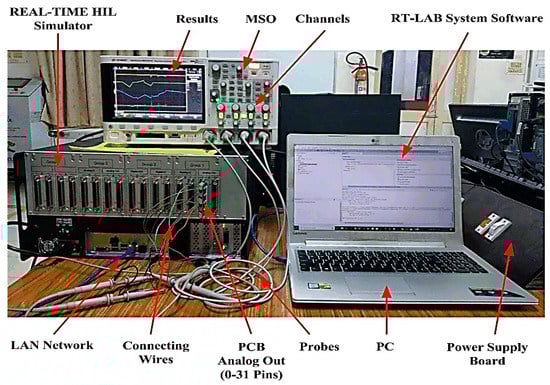 The OP5700 HIL Simulator was used to test the results using RT-LAB, MSOX3014T, programmable control board (PCB-E06-0560), probes, and connecting wires. The PCB can be used to interface between the simulation and real controller with the help of analog outputs and digital inputs to exchange the data. The real-time results setup is shown in Figure 10.