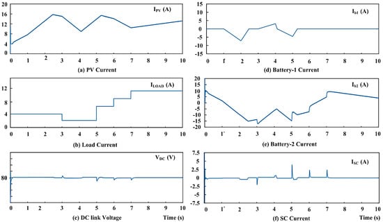 (a) DC link voltage, (b) battery-1 current, (c) battery-2 current, (d) super-capacitor (SC) current.