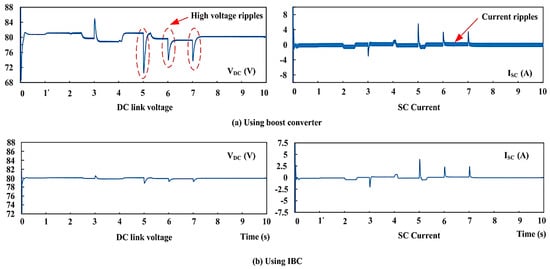 The simulation results of the proposed are presented in Figure 11. The analysis between the boost converter and IBC system results are shown in Figure 12. In the boost converter, the high ripple voltage and currents are presented in Figure 12a. The voltage drop at the DC link is more at the instant t5 in Figure 12a by 8V/s during sudden variations in the load at time t5 by 4A/s in Figure 11c; thus it affects the fast-acting DC link voltage regulation, and the high width of the current ripples and conduction losses in SC are presented in Figure 12a. It decreases the efficacy of the system. The IBC efficiently reduces the current and voltage ripples as shown in Figure 12b, and increases the performance and reliability of the system.