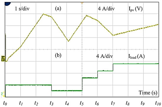 In the simulated model, the PV system rating of 40 V and the battery of ratings 48 V are considered. The IBC and bidirectional converters are operated to interlink the PV and batteries with the DC grid. The DC link reference voltage is 80 V and a variable source is connected to the DC link. The Real-Time HIL Simulator results are presented in Figure 13, Figure 14 and Figure 15. The irregular nature of the PV current profile varying between instants t1–t10 by 4 A/div is shown in Figure 13a, and Figure 13b shows the randomly varying load current profile by 4 A/div. During the variable PV and/or load conditions (Ppv > Pl or Ppv < Pl), there is a necessity to sustain power stability and provides fast DC voltage regulation into the system. At time t3, the load current is suddenly decreased by 2 A/div and at instant t5 suddenly increased by 4 A/div; in this period the drop of the bus voltage is much less when compared to boost converter.