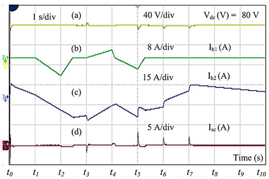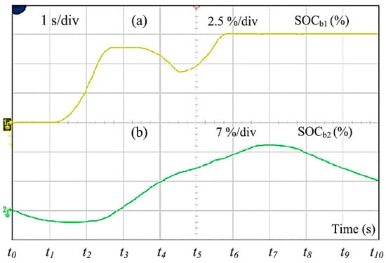 The battery-1 current is shown in Figure 14b. From Figure 14b, the difference between the Ppv(t) and Ps(t) can be seen. Figure 14c shows the battery-2 current. The battery-2 current varies according to the Ppv(t) and Pl(t). The battery-2 can not only preserve charging or discharging conditions, it can also sustain the power stability at the DC link. The SC current is shown in Figure 14d and it decreases the current stress on the batteries by responding to transients in the system. Figure 14a shows the constant DC link voltage. At instant t1–t3, the load current is constant by 4 A/div, thus during constant load conditions, there is no variation in the bus voltage. From t5–t7, the load current is increased by 2 A/div and PV current rises at instant t5 by 4 A/div and reduces after instant t5 to t7 by 4 A/div; at these instants, the voltage drop is less than 2 A/div and also maintained the stable DC bus voltage. Hence, it is clear that even sudden a change in load also does not affect the steady DC link voltage. The SOCs of battery-1 and battery-2 is shown in Figure 15a,b. The SOC of batteries will respond according to the charging and discharging conditions of battery-1 and battery-2.
