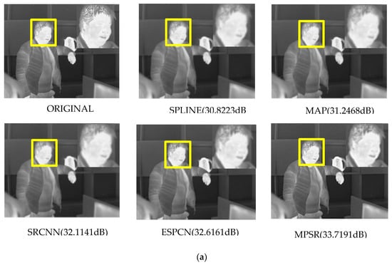 MPSR has two improvements. Firstly, because the texture of the infrared image is not obvious, the image details are enhanced before the super-resolution reconstruction, and then the image is reconstructed with the improved biregular objective function. Secondly, the regularization objective function is combined with sub-pixel convolution. Instead of taking the enlarged high-resolution image as the input, the low-resolution image is taken as the input. Finally, the sub-pixel convolution is used to enlarge the image to the required multiple, which not only reduces the complexity, but also enhances the reconstruction effect. The effectiveness of these two parts is verified by experiments, as shown in Figure 6.