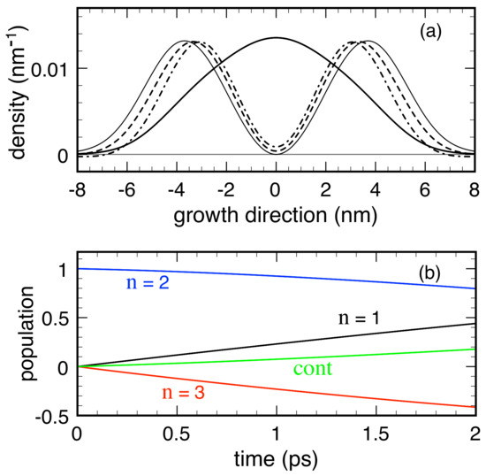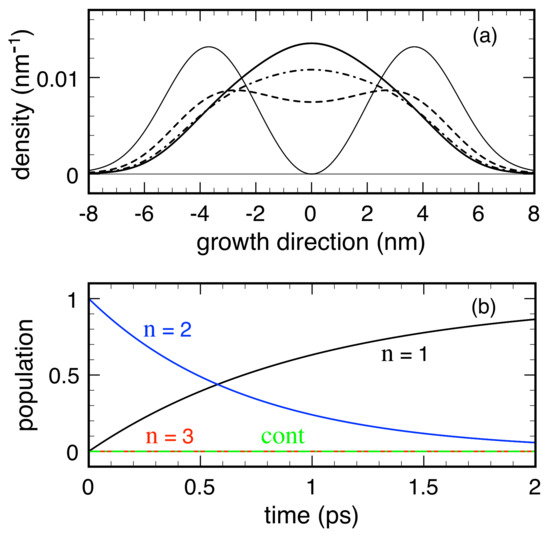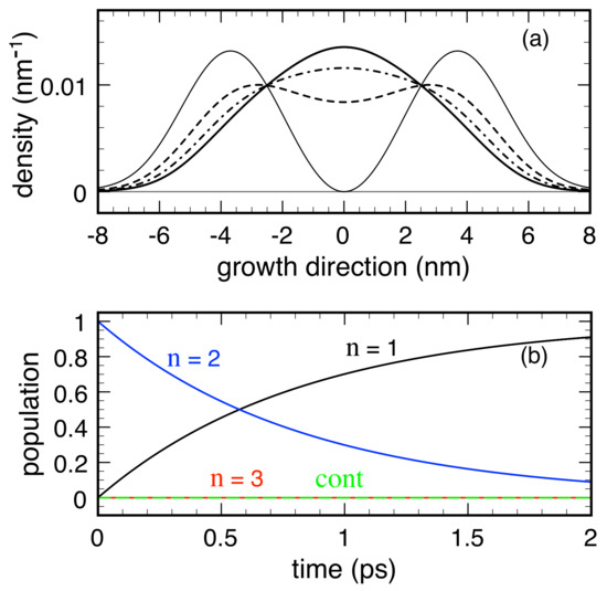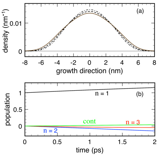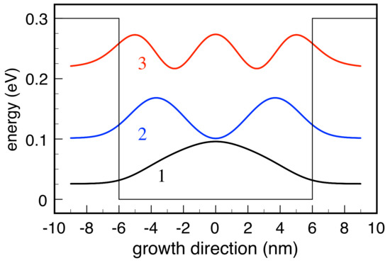 Due to confinement along the growth (z) direction, the system three-dimensional (3D) electronic states exhibit the usual subband structure. However, within the prescription of the RTA dissipation model in Equation (4), we neglect the in-plane phase-space coordinates and adopt an effective one-dimensional (1D) description: The set of single-particle quantum numbers then reduces to the discrete index () of the confined 1D state only and . Figure 3 shows the three bound energy levels and squared envelope functions for the model case of a GaAs/(Al,Ga)As 12 nm-thick QW, with a conduction band offset of 0.3 eV. In the following, we resume the results of simulated experiments performed on this nanosystem in the low-temperature regime, thus assuming that the QW lowest energy level () corresponds to the thermal-equilibrium condition. In particular, we analyze the spatial carrier-density profile, along the growth direction, corresponding to the 1D Wigner function , namely