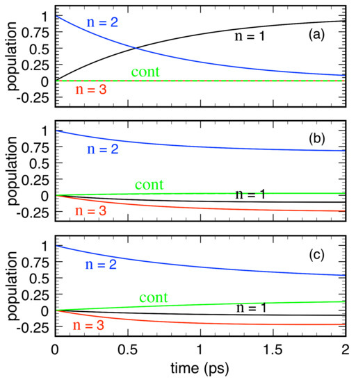 Bound-state populations [see Equation (15)] as well as the continuum (cont) contribution as a function of time for model:s M1 (a); M2 (b); and M3 (c). Reprinted from [61].