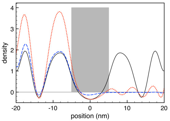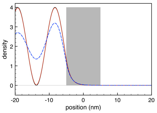 To confirm the quality and physical soundness of the non-local RTA model in Equation (32), we have repeated the simulated experiments of Figure 10 for a thinner ( nm) and lower ( meV) barrier. Opposite to the original (almost transmission-free) barrier profile in Figure 10, in this case, the transmission coefficient is about 25 %, leading to a significant tunneling dynamics across the barrier. This scenario is fully confirmed by the new results reported in Figure 11: while in the left portion of the device the role played by dissipation phenomena is similar to the one reported in Figure 10, here, in addition, we deal with a relevant tunneling across the barrier, leading to a significant charge distribution in the right portion of the device as well. In particular, while the coherent-limit result (solid curve) coincides again with the weak-dissipation one (dashed curve), in the strong-dissipation regime (dash-dotted curve), we deal again with a suppression of the left-side interference pattern, and to a decoherence-induced suppression of the tunneling dynamics.