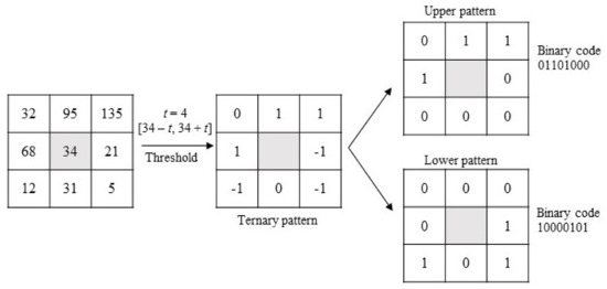 Tan and Triggs [51] presented a new texture operator which is more robust to noise than LBP in uniform regions. It consists of an LBP extended into 3-valued codes (0, 1, −1). Figure 3 shows a practical example of how Local Ternary Patterns (LTP) work: first, threshold t is established. Then, if any neighbor pixel has a value below the value of the central pixel minus the threshold, it is assigned −1 and, if the value is over the value of the central pixel plus the threshold, it is assigned 1. Otherwise, it is assigned 0. After the thresholding step, the upper pattern and lower pattern are constructed as follows: for the upper pattern, all 1’s are assigned 1, and the rest of the values (0s and −1’s) are assigned 0; for the lower pattern, all −1’s are assigned 1, and the rest of the values (0s and 1’s) are assigned 0. Finally, both patterns are encoded in two different binary codes, so this descriptor provides two binary codes for one pixel instead of one as LBP does, that is, more information about the texture of the image. All of this process is shown in Figure 3.