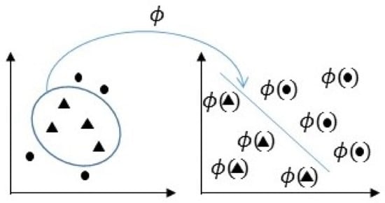 The main idea of SVM is to select a hyperplane that is equidistant to the training examples of every class to be classified so that the so-called maximum margin hyperplane between classes is obtained [54,55]. To define this hyperplane, only the training data of each class that fall right next to those margins are taken into account, which are called support vectors. In this work, this hyperplane would be the one which separates the characteristics obtained from pain and non-pain facial images. In cases where a linear function does not allow for separating the examples properly, a nonlinear SVM is used. To define the hyperplane in this case, the input space of the examples is transformed into a new one, , where a linear separation hyperplane is constructed using kernel functions as they are represented in Figure 5. A kernel function is a function that assigns to each pair of elements a real value corresponding to the scalar product of the transformed version of that element in a new space. There are several types of kernel, such as: