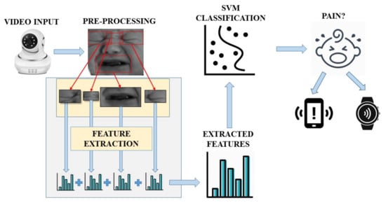 Finally, a previously trained SVM classifier decides if the input frame corresponds with a baby in pain or not. The system will be continuously monitoring the video frames obtained and sending an alarm to the mobile device if a pain expression is detected.
