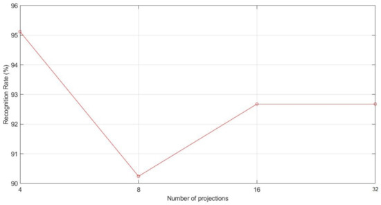 The parameter to be calculated in the RBC method is the number of projection angles. To do this, typical values 4, 8, 16, and 32, as considered in [53], have been chosen. The results of the carried tests are shown in Figure 9.