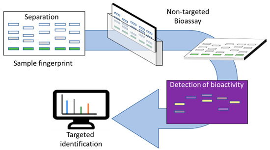 The hyphenation of (HP)TLC with spectroscopic and spectrometric techniques makes the characterization of bioactive substances possible. HPTLC combined with bioassays and linked to spectroscopic methods of identification, allows the quantitative detection of bioactive compounds (as bands) in samples and their further chemical characterization by mass spectrometry or other spectroscopic methods (Figure 1). Thus, highly efficient non-targeted screening with bioassays can be used to detect modes of action followed by the targeted chemical identification of newly discovered bioactive compounds. Non-targeted analysis is superior to target analysis, if the whole sample (botanical extract) is of interest.
