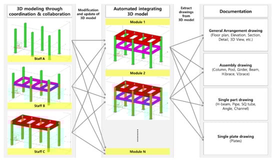 During the design phase, documentation that provides information in connection with manufacturing and construction is very important. In particular, it is very important to improve the productivity of the documentation of structural steel frame that the member is to be pre-fabricated in the factory and is delivered into the construction site []. Although the information for manufacturing should be produced without design errors and delivered to the fabricator, a 2D-drawing-based documentation method is still commonly used. On the other hand, the documenting method of extracting plan, elevation, and section views required for documentation from the 3D model can generate more accurate information than the documentation method based on 2D drawing.