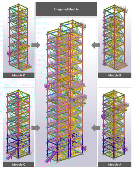The case of this study is a plant facility consisting of four modules as the Engineering Procurement Construction (EPC) project as shown in Figure 2. 3D modeling was performed based on the design documents provided by the client, and the drawings needed for the fabrication were made using the 3D model. The whole module consists of four modules. Module A (180.96 Ton) consists of 1965 production drawings, Module B (120.06 Ton) consists of 1216 production drawings, Module C (114.06 Ton) consists of 939 drawings, and Module D (120.94 Ton) consists of 1175 drawings. A total of 5295 production drawings were delivered.
