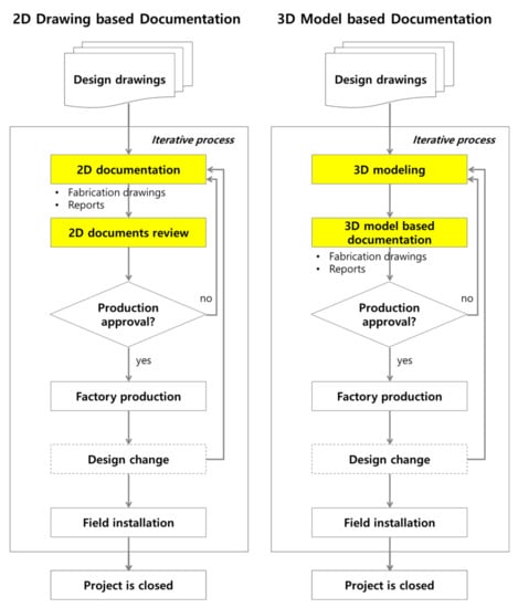 Detailed process of 2D-drawing-based documentation and 3D-model-based documentation.
