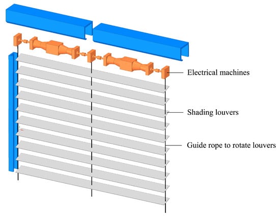 Natural ventilation comprises two mechanisms: Wind-driven ventilation and buoyancy-driven ventilation. In wind-driven ventilation, when a building undergoes the approaching airflow, wind pressure difference between two facades can drive natural ventilation and air penetration to supply fresh air to indoor environment from the outside [,,]. In coastal areas and hot climatic regions with sufficient wind energy, natural ventilation between openings of building surfaces has become a common method of cooling. Wind environment is sensible to many factors, such as wind direction, building structures and surrounding conditions [,]. As a common type of building component, external shading louvers can affect airflow patterns around buildings. Figure 1 shows an array of shading louvers and the control system to rotate louvers. When the rotation angle of louvers changes, it can affect the wind speed and incident angle, resulting in fluctuations in natural ventilation around the shaded building. The presence of shading louvers must be considered in wind pressure investigation.