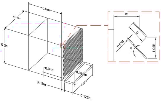 The airflow field around the cube building was experimentally measured at a scale of 1:30 with or without shading louvers by Jiang et al. []. The wind tunnel test section was 12 m × 1.8 m × 1.8 m, and the blocking ratio is below 8%. The scales of the test building were 0.5 m for all building edges, and 26 rows of single-sided sunshade louvers were installed near the windward surface. There were five blinds in each row. The slat size was 93 mm (length) × 17.5 mm (width) × 1.0 mm (thickness), and the spacing between adjacent rows was 18.3 mm. The rotation angle of the shading louvers was 45°, and the windward surface was normal to the approaching airflow. The geometric model of the single-shaded building is shown in Figure 2. All louvers have the same rotation angle θ. In Figure 2, W is taken as 0.025 m, and B is taken as 0.0175 m.