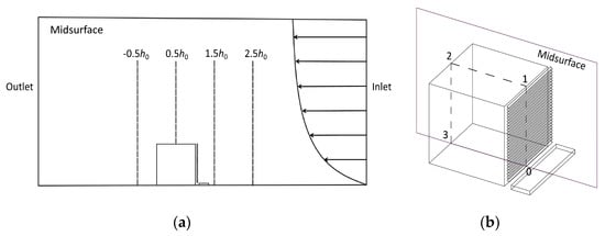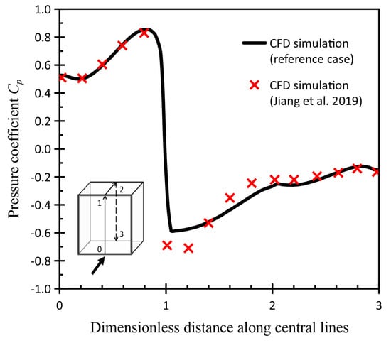 Validation was performed by comparing the deviation between the numerical results of the reference case and the experimental data from Jiang et al. []. In that reference, research with experimental and numerical results, allowed the velocity value to be measured at some points along several lines, which was on the mid-surface of the cubic building and perpendicular to the ground in the wind tunnel, while wind pressure coefficients were investigated along three lines on the intersection between building surfaces and the mid-surface in CFD simulations. The normalized velocity Un as shown in Equation (6) is to demonstrate the airflow velocity distribution: